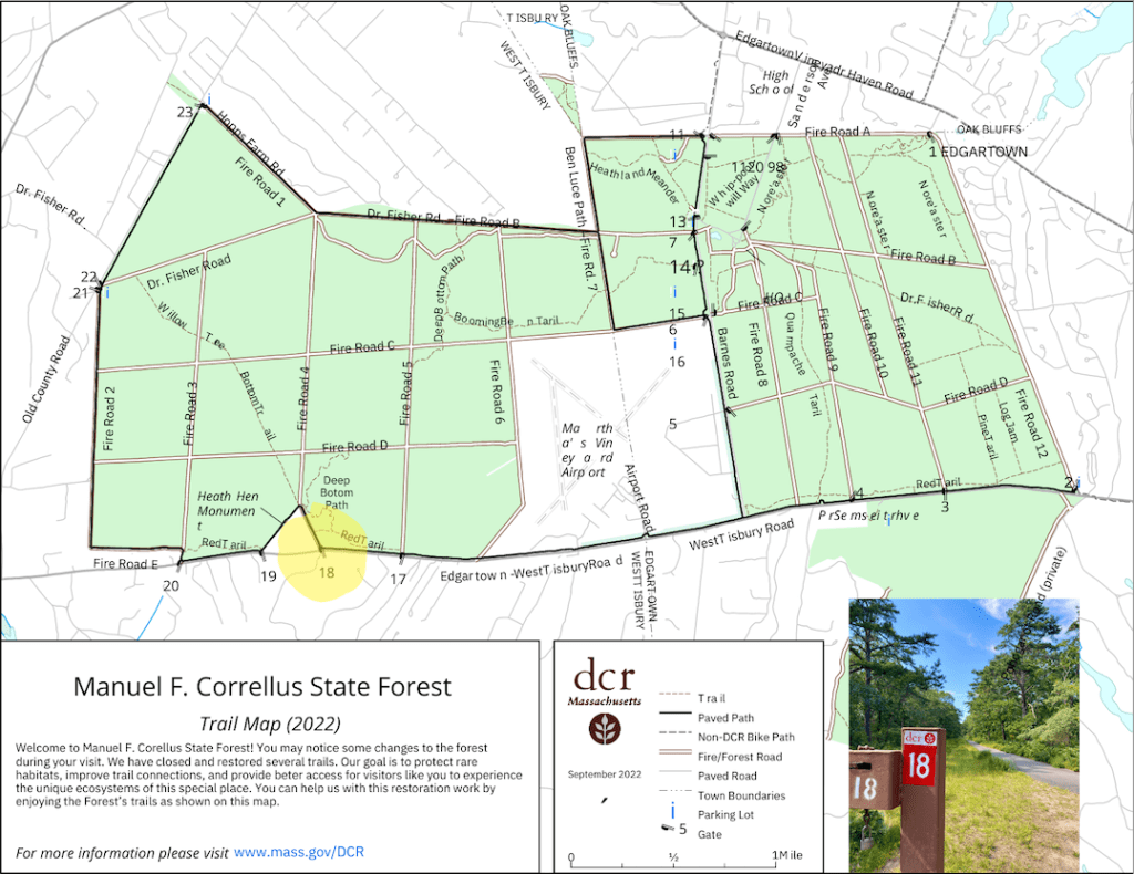 The 5300 acre Forest began as the Martha’s Vineyard Heath Hen Reservation in the early 1900’s with several hundred acres dedicated to saving the Heath Hen, on what was then known as the Great Plains, the glacial sand plain in the heart of the Island. This pioneering effort to save the Heath Hen failed, but led to the establishment of the Martha’s Vineyard State Forest, now known as the Manuel F. Correllus State Forest, honoring its first, long-serving Superintendent.