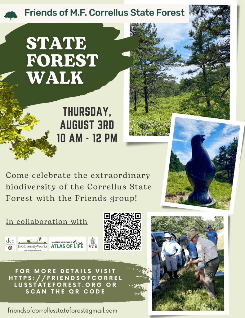 On Thursday, August 3, from 10-12 AM, the Friends of Correllus State Forest and the Massachusetts Department of Conservation and Recreation will hold a walk celebrating the extraordinary biodiversity of the Forest. Collaborating in the walk also will be the Vineyard Conservation Society (VCS) and BiodiversityWorks. Each organization has a long association of advocacy and support for the Forest. Parking will be made available at Gate 18.